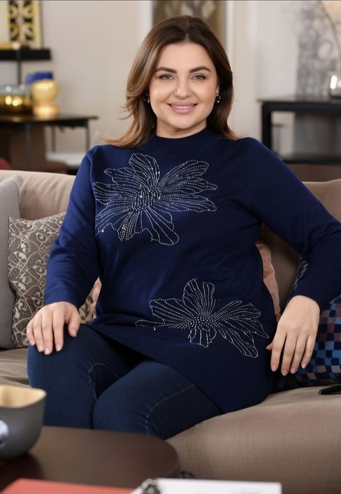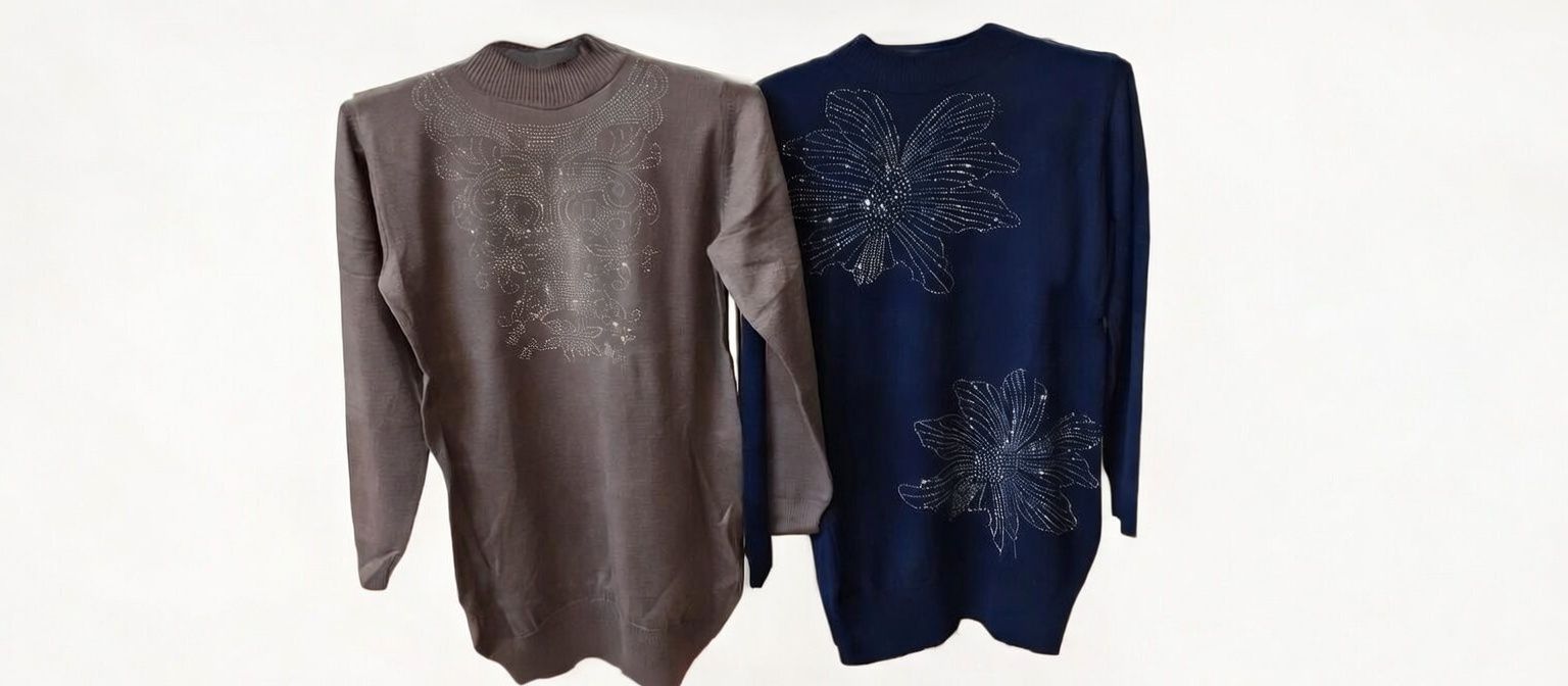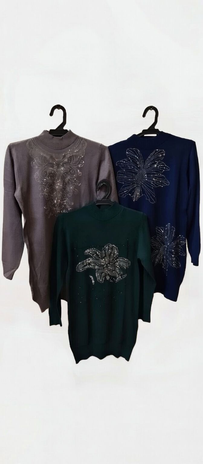 این بلوز بافتنی بلند نگیندار با طرح گل بزرگ کریستالی (رایناستون/نگین براق) خیلی شیک و خاص هستن. مشخصات کاملشون بر اساس عکس و مدلهای مشابه free size زنانه اینجوریه: