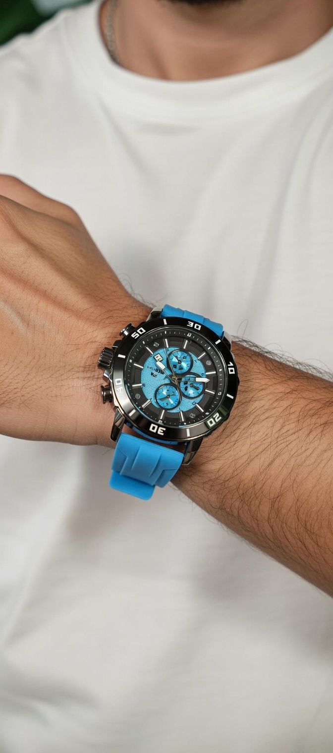 بند سیلیکونی آبی آسمانی و قاب مشکی براق… انگار دریا و آسمان تو مچ دستت یکی شدن. اسپرت، مدرن و پر انرژی – دقیقاً همون چیزی که استایلت رو یک لِوِل بالاتر میبره! :watch::ocean: #ساعت_آبی #ChronographStyle #LaurierVibes»