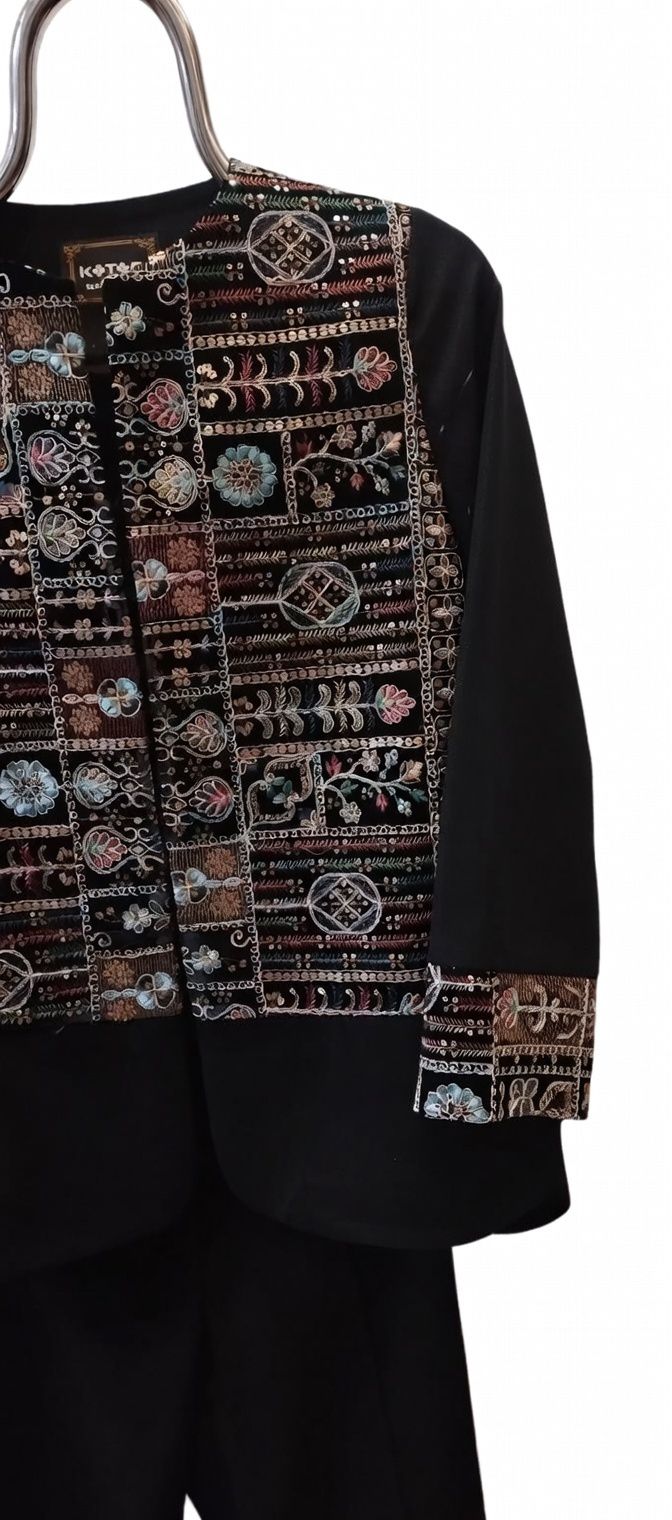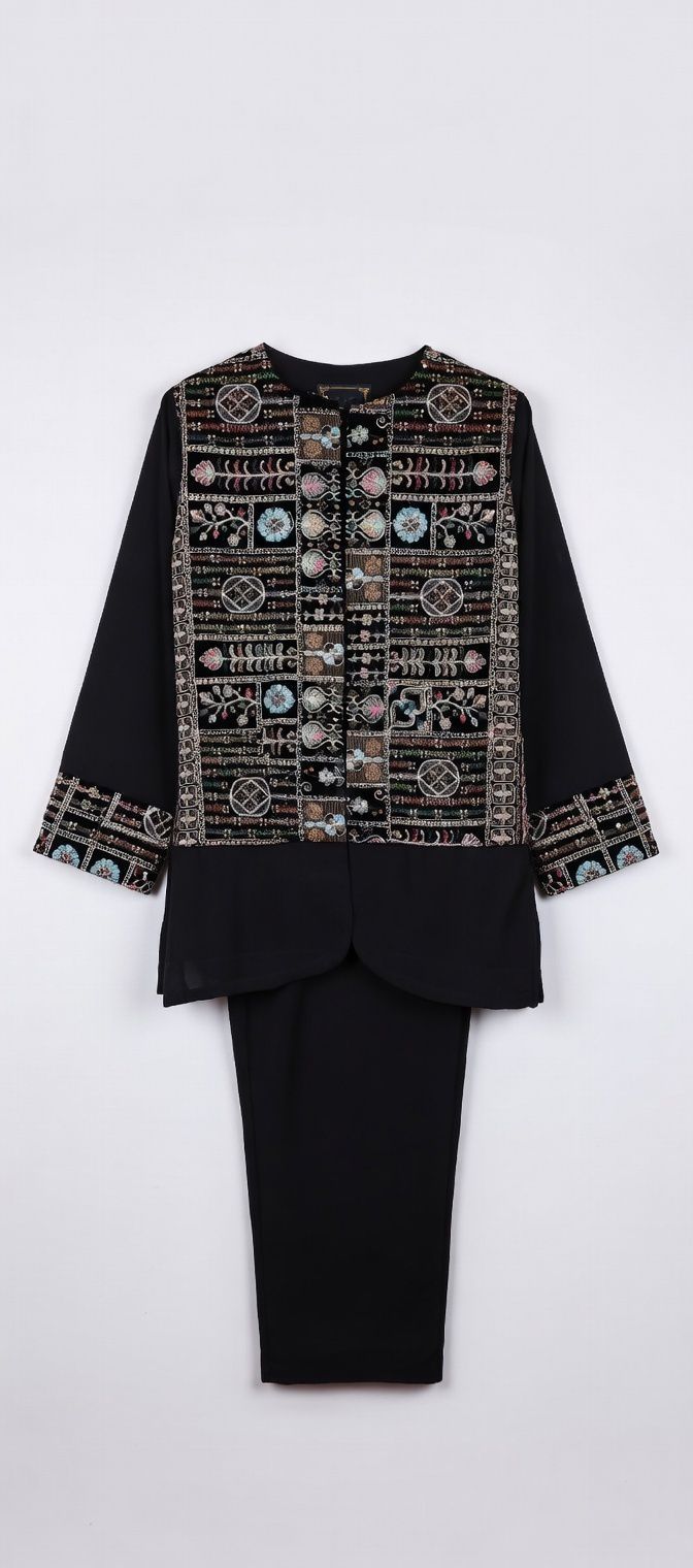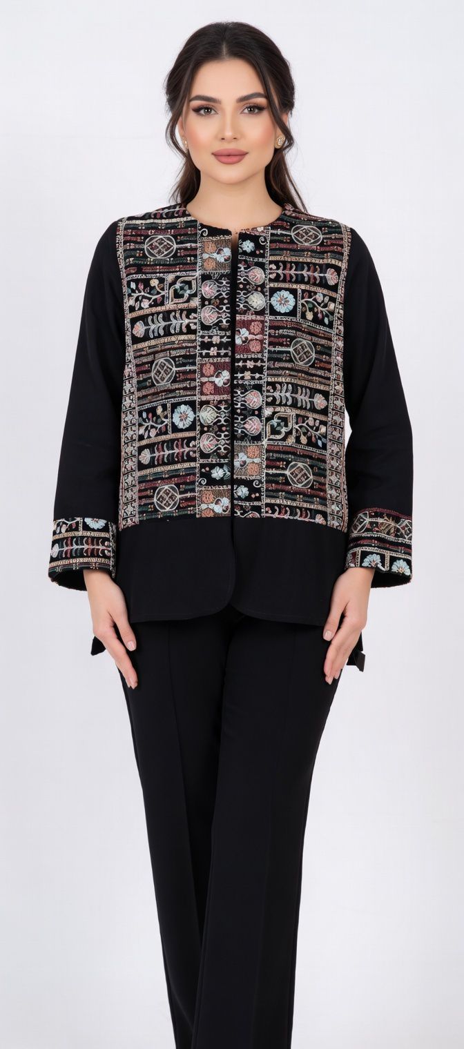 زمینه کرپ مشکی مات با گلدوزیهای ظریف و رنگارنگ (طرح گل و بوته، ترنج و حاشیههای هندسی) روی یقه، جلو، آستین و لبهها – نخهای متالیک و رنگی زنده که در نور میدرخشند.