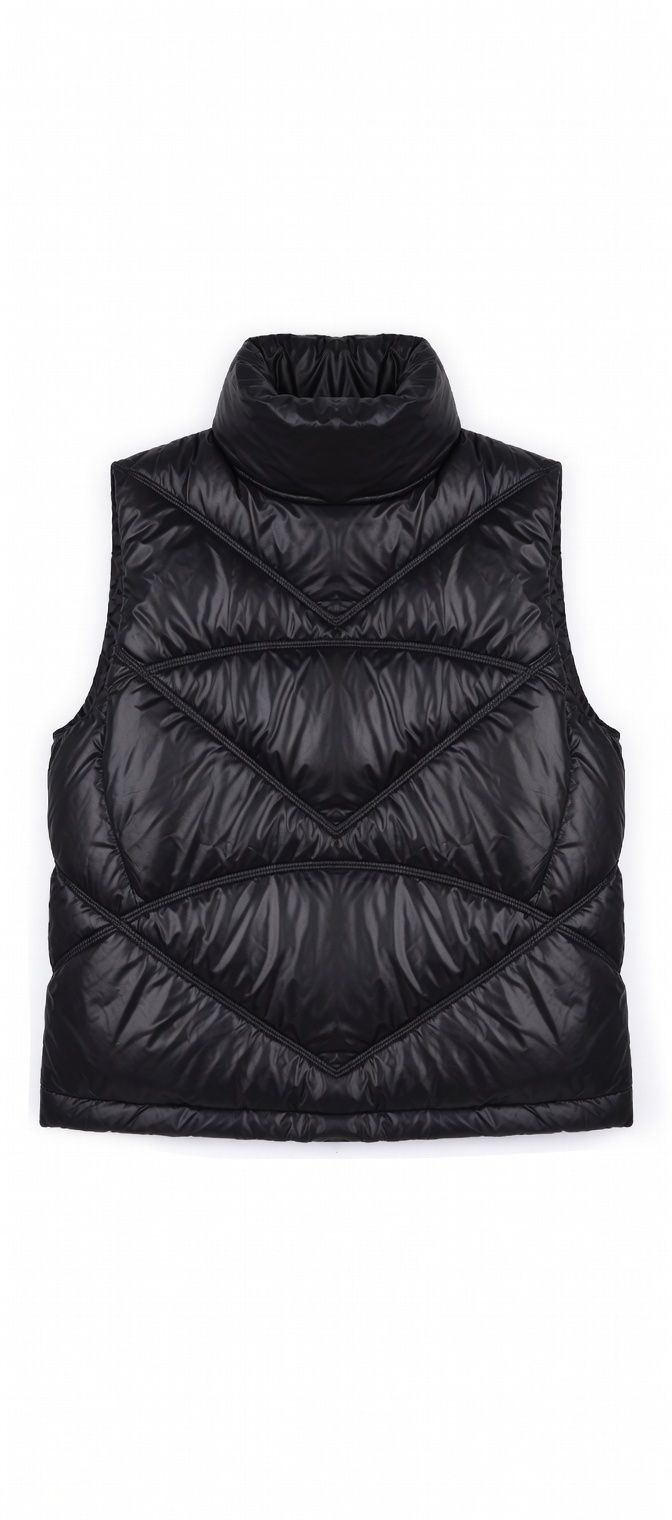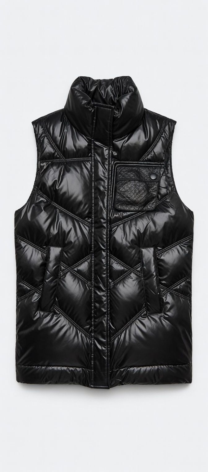 ین وست پافر (puffer vest) کوتاه و کراپشده از ، با طراحی شیک و براق مشکی، یک آیتم ترندی و گرم برای لایهلایه پوشیدن در فصل سرد است. مناسب استایل کژوال، اسپرت یا حتی نیمهرسمی، با یقه ایستاده بلند، زیپ جلو، جیب روی سینه با جزئیات کوئیلت (quilted) و الگوی الماسی/هندسی دوختهشده.