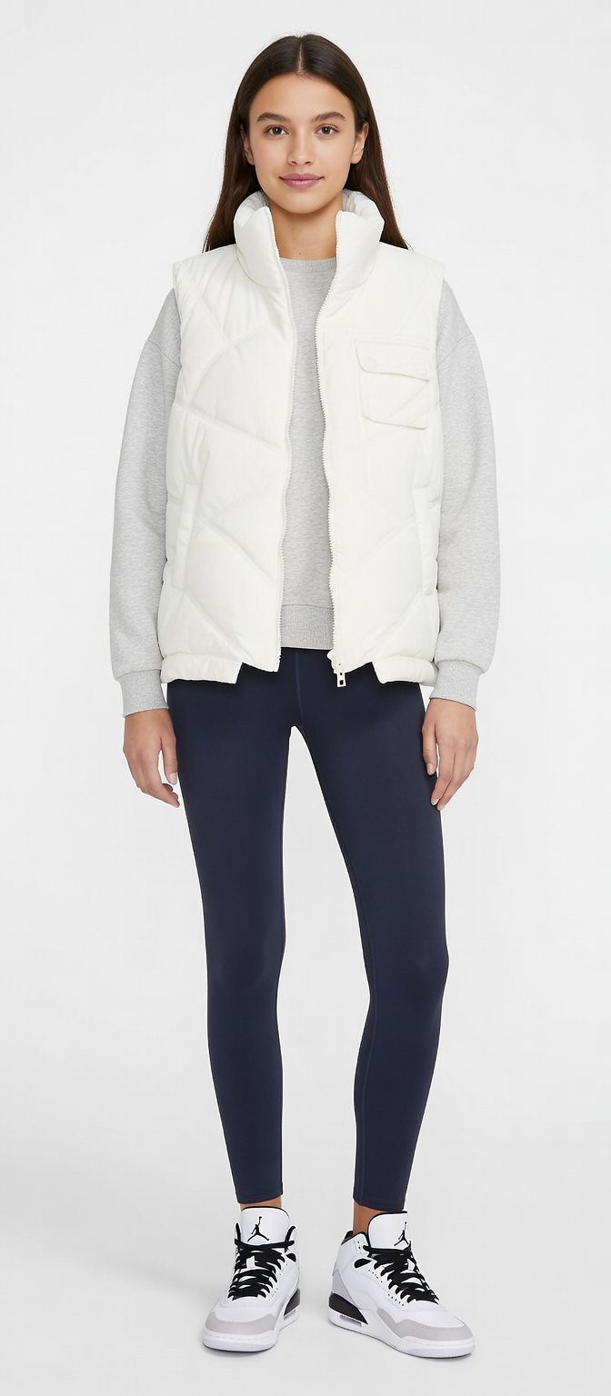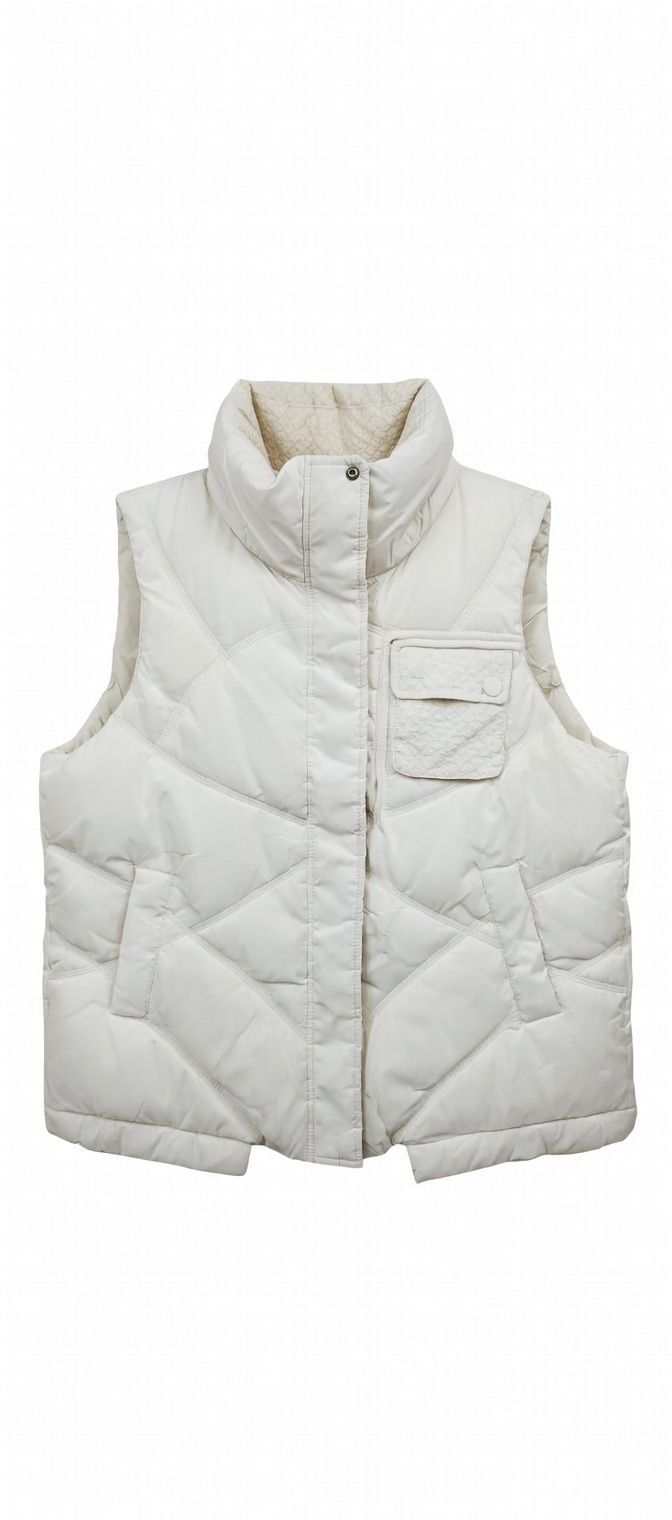 طراحی: کراپ کوتاه (cropped)، بدون آستین، یقه ایستاده بلند (stand-up/high collar)، زیپ کامل جلو، جیب روی سینه با دکمه یا snap، دوخت کوئیلت الماسی/زیگزاگ برای حجم و استایل